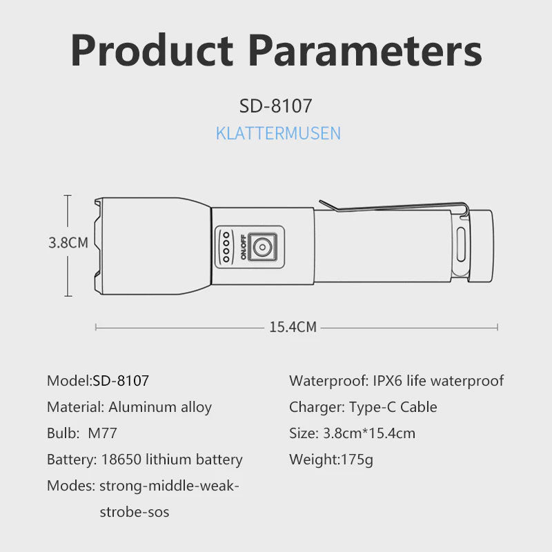 Smiling Shark SD-8107 Super Bright 7000 Lumens Type-C Rechargeable Torch Light Torches Rechargeable Flashlight Lighting 5 Models Zoomable Waterproof
